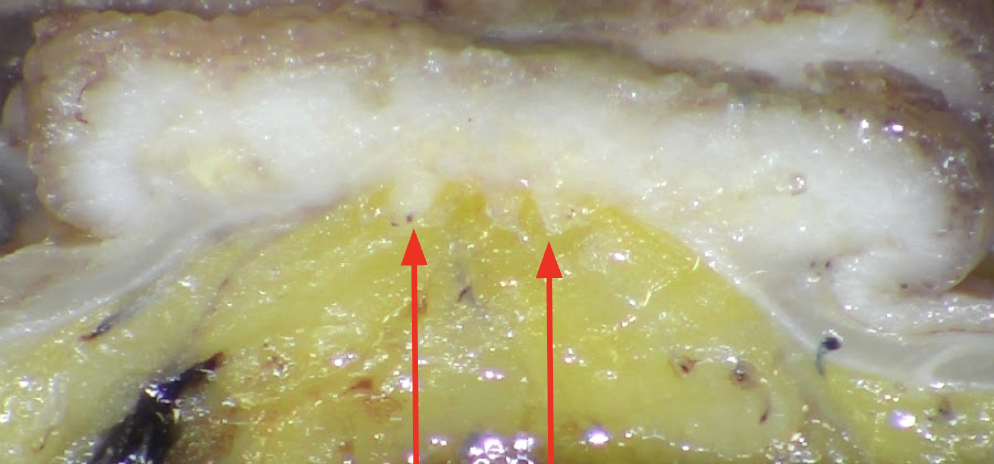 At this point, you can no longer identify an intact muscle layer separating tumor from fat. The red arrows show tumor extending into the fat.