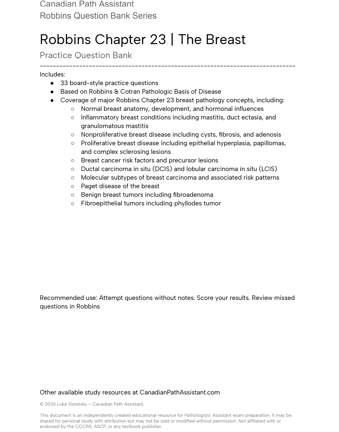 This Robbins Chapter 23 question bank is designed to help Pathologists’ Assistant students review the key breast pathology concepts covered in Robbins & Cotran Pathologic Basis of Disease.